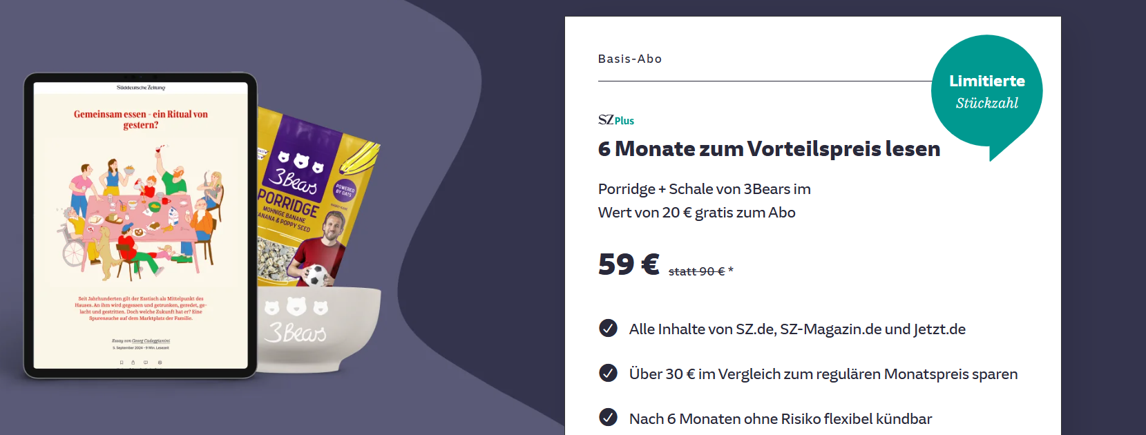 Bei dem Angebot zahlen Sie insgesamt nur 59 € statt knapp 89,94 € für das SZ Plus Basis Halbjahresabo und erhalten eine 3Bears Porridge Schale und ein Porridge gratis, was einer Gesamtersparnis von über 50 € entspricht. Ab dem 7. Monat kostet das Abo ohne Kündigung 14,99 € mtl. für weitere sechs Monate und ab dem 13. Monat 19,99 € mtl.