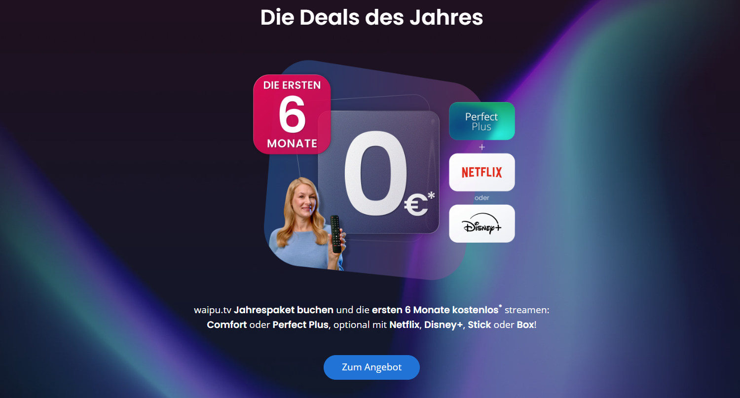Cyber Week bei waipu.tv: Nur für kurze Zeit erhalten Sie die ersten sechs Monate gratis bei ausgewählten Jahrespaketen, Vorteilspaketen und Kombipaketen inkl. Netflix und Disney. So ist z. B. das Perfect Plus Kombipaket mit Netflix Standard die ersten sechs Monate gratis, ab dem 7. Monat fallen 17,99 € mtl. an. Mit waipu.tv können Sie über das Internet auf über 310 Free- und Pay-TV Sender zugreifen, zusätzlich sind über 40.000 Filme, Serien und Shows in der waiputhek verfügbar. Je nach gewähltem Paket erhalten Sie Zugang zu allen Inhalten von Disney+ oder Netflix on top.