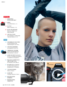 Im Abschnitt "News" werden unter anderem spannende Canon-Neuheiten vorgestellt. Der Technikteil bietet ausführliche Tests von Kameras und Objektiven, beispielsweise die Hasselblad X2D II 100C und das lichtstarke Sigma 135 mm f/1,4 DG (A). Ein Praxistest widmet sich dem Alles-in-einem-Zoom-Objektiv Tamron 25–200 mm für Sony E-Mount.