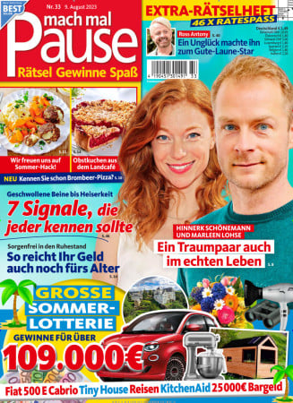 In der Zeitschrift Mach mal Pause finden Leser unterhaltsame Themen aus der Welt von Film und Fernsehen kommen ebenso zur Sprache wie mitreißende Schicksale oder Tipps für die Familienzeit. Auch für die Ratgeber, saisonale, klassische und trendige Kochrezepte sowie medizinische und Gesundheitsthemen finden die Leser in dem Mach mal Pause Magazin. Einen wichtigen Schwerpunkt bilden die Rätsel: Auf rund 100 Seiten sind knifflige oder einfache Denksportaufgaben zu lösen. Ob Sodoku, Kreuzworträtsel oder Zahlenspiele, Denksport-Aufgaben nehmen einen wichtigen Teil des Hefts ein. Der Inhalt der Mach mal Pause Zeitschrift ist in die folgenden Rubriken aufgeteilt: